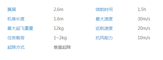 縱橫CW-10大鵬復合翼無人機,翼展2.6米,最大續航時間90分鐘,最大載荷達2kg,巡航速度為20m/s。同時采用RTK定位,定點起降,精準作業。在航空測繪、管線巡檢、應急、監視等領域,有著較為寬廣的運用。