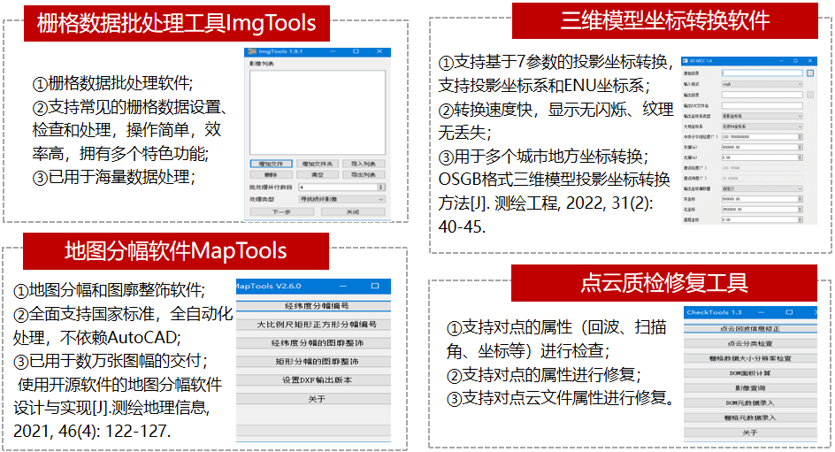 此外,還研發了掌握自主知識產權的地圖分幅軟件MapTools、三維模型坐標轉換軟件、點云質檢修復工具等內業生產軟件。這些軟件進行了大量理論和方法的創新,操作簡單方便,化繁為簡,實現了對海量點云、影像、三維模型等的批量化、自動化處理,大大提高了內業生產效率,支撐了眾多項目的進度和交付。相關研究成果已發表在《遙感信息》、《測繪地理信息》、《測繪工程》、《地理信息世界》等中文學術核心期刊,獲得了多項國家發明專利、軟件著作權授權及一項軟件產品認證。