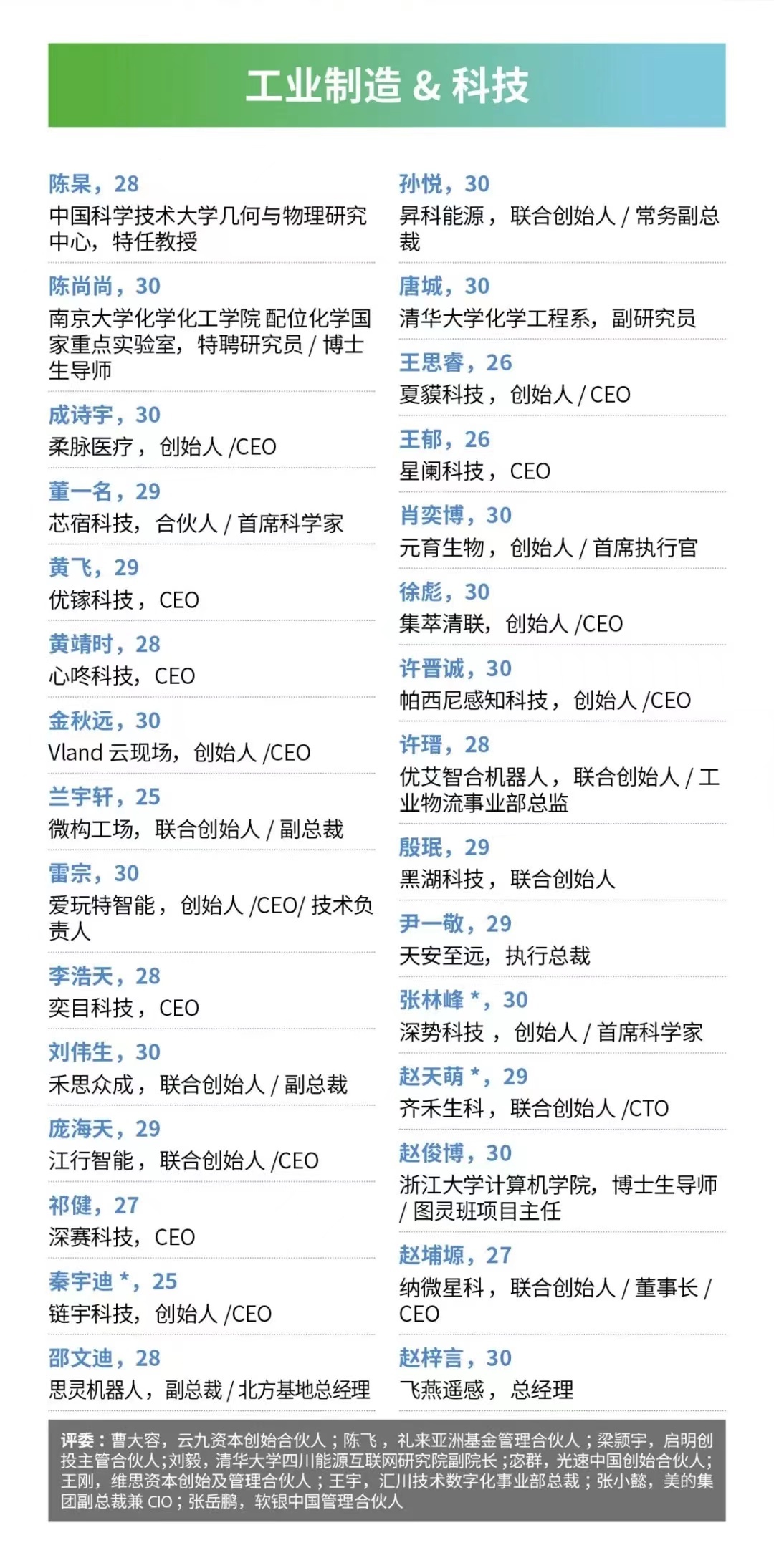 福布斯一貫以前瞻性的目光,尋找那些30歲以下,在業內嶄露頭角,或者展現出成為未來行業及社會翹楚的潛在力量。