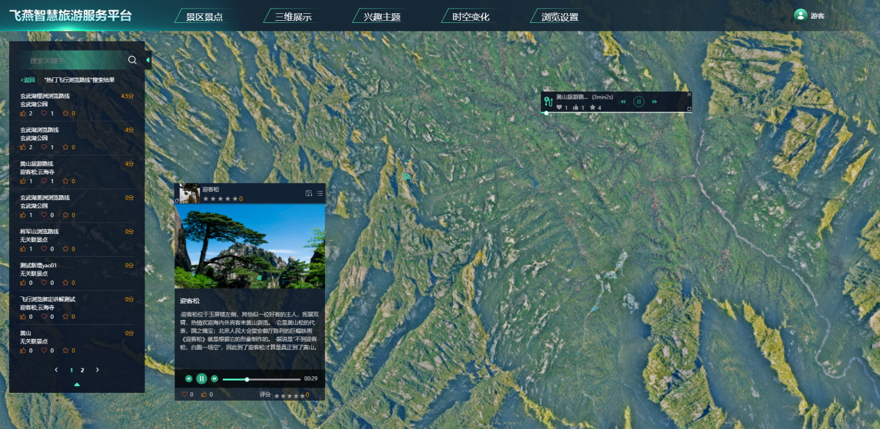 三維智慧旅游平臺,基于景區實景三維模型和二維地圖,提供景區場景三維展示、推廣宣傳、資源管理、服務管理和景區救援等功能。