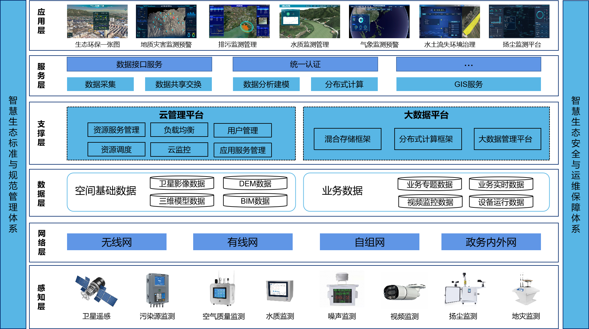 系統整體框架分為基礎設施層、數據層、服務層、業務層和應用層,提供具備基于地理空間特征的實景數據底座和監測站點的指標信息服務。
