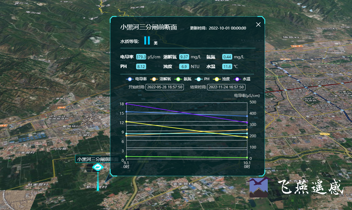本系統通過自有無人機設備獲取了測區20km2的3.5cm分辨率數據,制作了數字高程模型DEM、衛星影像、傾斜模型等數據,構建了三維場景底座,并結合國控站點指標監測等功能為用戶提供輔助決策支持,以達到科學管理的目的。