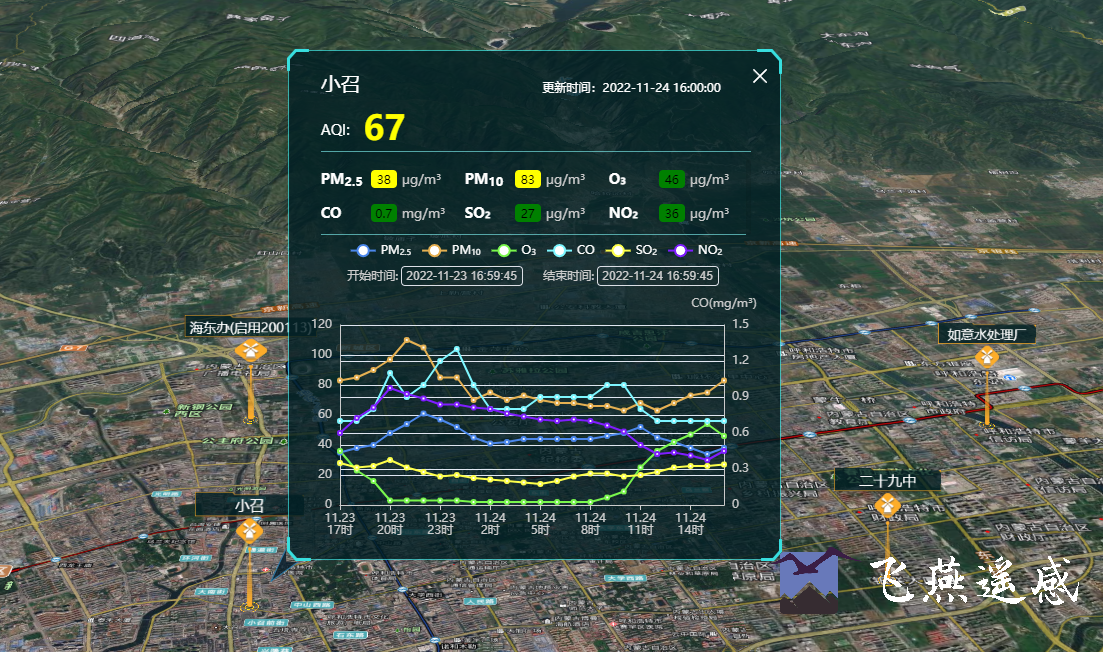 近日,飛燕遙感承接的智慧環保項目獲得驗收。實景三維平臺基于地形、影像和傾斜模型等多源異構數據構建三維場景底座,融合國控檢測站物聯感知數據,實現生態環境空間化、動態化管理。