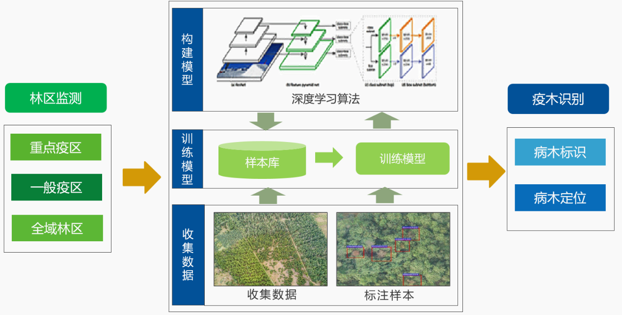 利用無人機、大飛機等監測平臺采集林區數據,依托自主研發識別AI算法,構建人工智能數據樣本庫,覆蓋多時期、多樹種多脅迫等樣本數據,以支撐高性能算法模型的訓練和識別。
