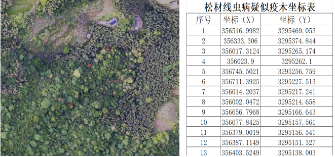 3.成果導出,AI松材線蟲病識別完成后生成帶標識成果圖和疑似疫木坐標表。