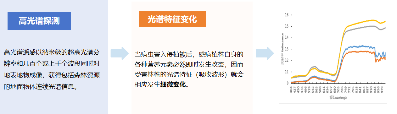 高光譜遙感以其強大的光譜敏感性(納米級的窄通道)能夠探測到植被在病蟲害侵害早期與健康植被的細微光譜差異,為森林病蟲害的早期監測預警提供了可能。通過AIMS多模態航攝獲取高分辨率的影像數據、多光譜數據及點云數據,時空同步的多源數據融合,結合機器學習,利用林業領域的知識庫進行訓練,可以做到單木級別的松材線蟲染病樹木的自動化提取。基于樣本調查、目視解譯、圖像識別、機器學習、深度學習等方法解決林業病蟲害方面的需求。