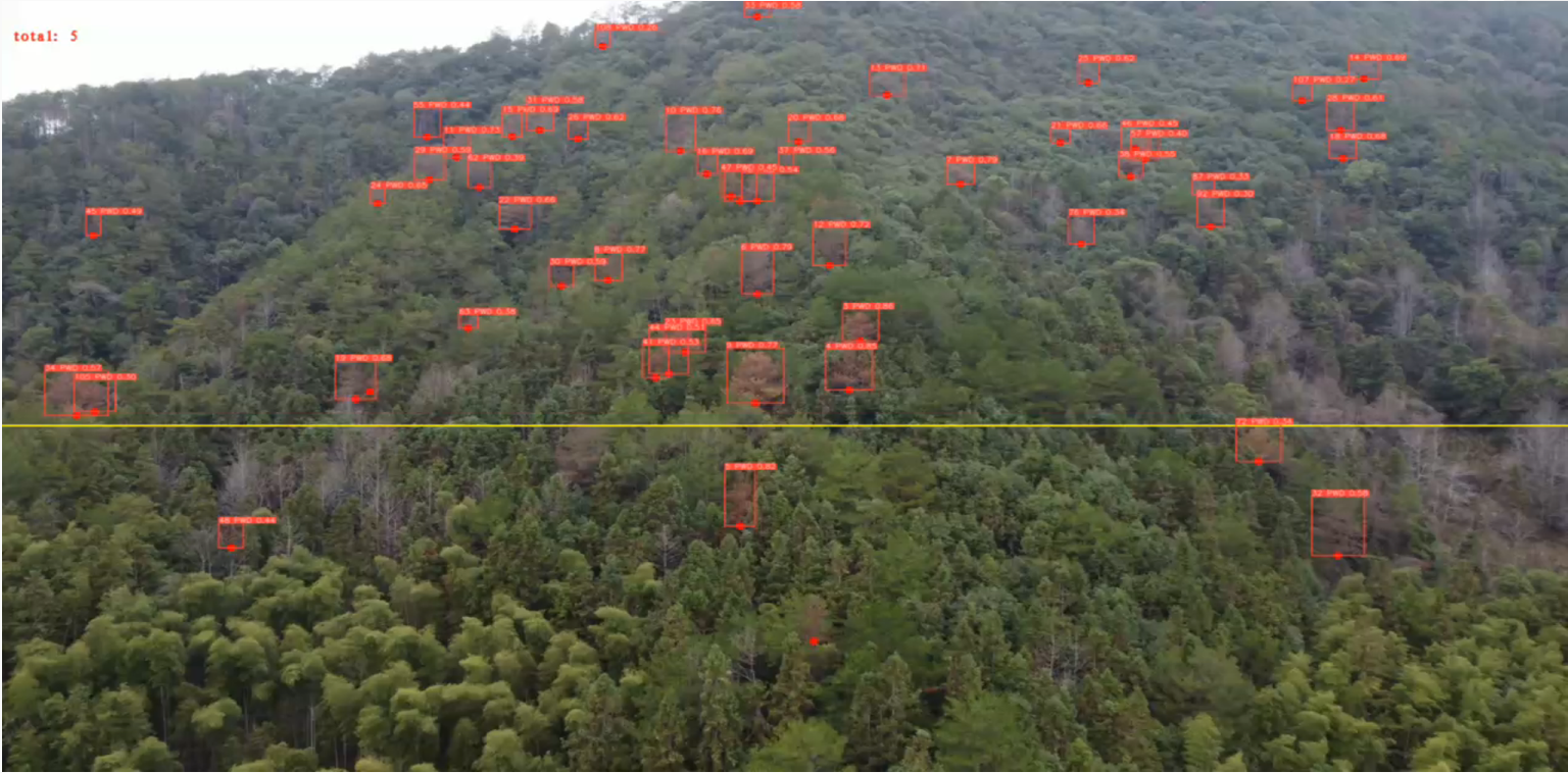 松材線蟲病死樹出現的高峰期在每年的8—10月份,一株松樹感染松材線蟲病最快40天左右就會死亡。飛燕遙感AI智能識別方案具有監測速度快、識別準確率高、實施成本低的特點,能夠及時發現松樹異常情況,確保疫情早發現、早除治。