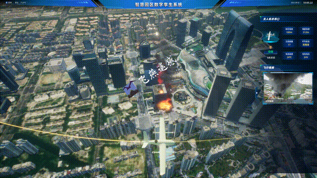 (2)智能聯(lián)動,園區(qū)火警觸發(fā)三維地圖自動標定火源坐標,同步調(diào)度巡邏車輛、視頻監(jiān)控、無人機等實施偵察,實時回傳火情態(tài)勢,強化應(yīng)急響應(yīng)時效性。