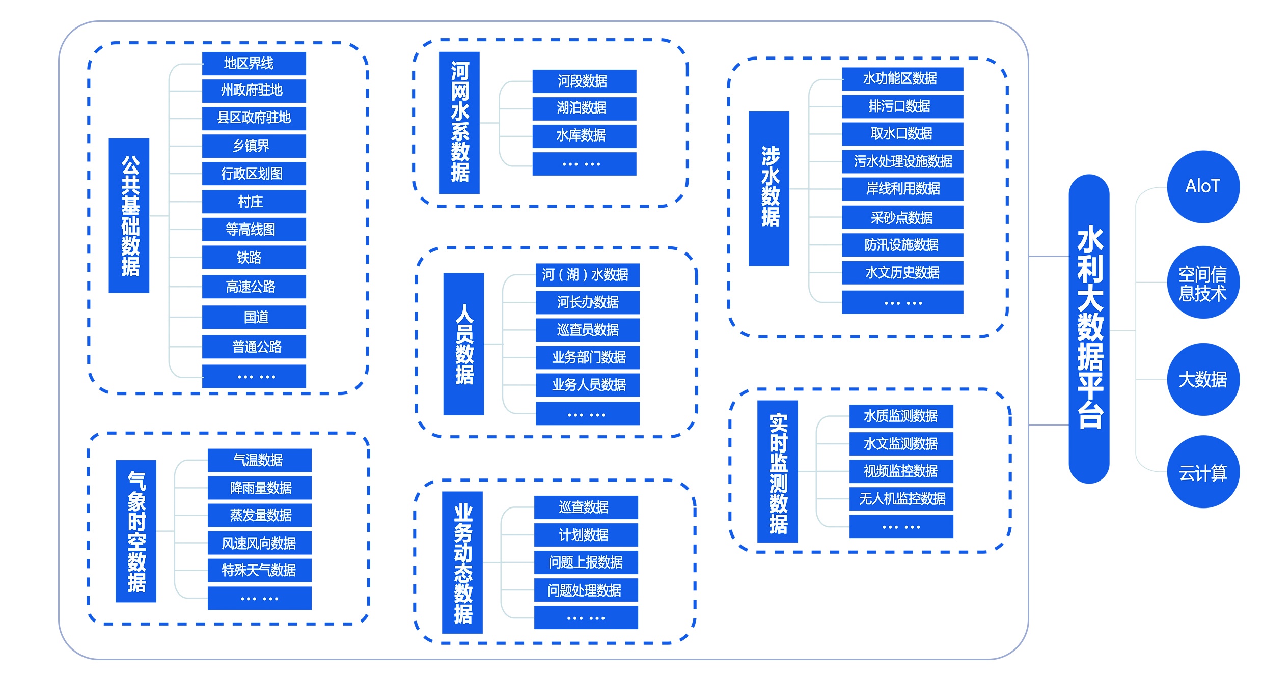 水利大數據平臺依托于云計算技術,大數據技術、空間信息技術、ALOT智能物聯網技術,通過地理信息基礎數據、水利實時監測數據、氣象時空數據、業務動態數據,實現河道產匯流分析、水情水質相關關系分析、水質水量調度分析、受災影響預測、河段水污染風險分析等,為水利業務決策提供科學依據。